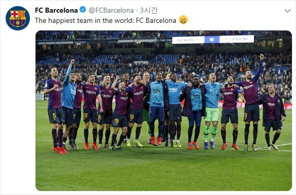 바르셀로나는 지난 시즌 '라이벌' 레알 마드리드와 네 차례 대결에서 2승2무를 거둔 데 이어 올 시즌도 3승1무의 우위를 기록했다. 덕분에 역대전적에서 96승51무95패로 우위를 잡았다.(사진=FC바르셀로나 공식 트위터 갈무리)