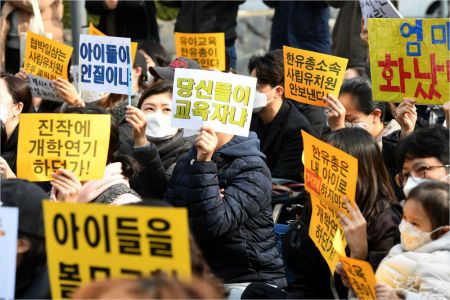 한유총이 기자회견을 통해 개학연기 뿐만 아니라 폐원까지 검토하겠다고 밝힌 3일 오후 경기도 용인시 수지구청 앞에서 수지 사립유치원 학부모 비대위 회원들이 개학연기를 규탄하는 집회를 갖고 있다.(사진=황진환기자)