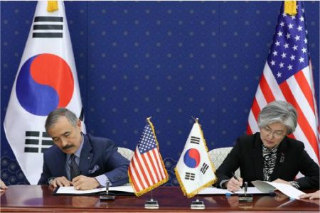 지난 8일 한미방위비분담금 특별협정(SMA)에 공식 서명하는 해리 해리스 주한미국대사와 강경화 외교부 장관. (사진=연합뉴스 제공)