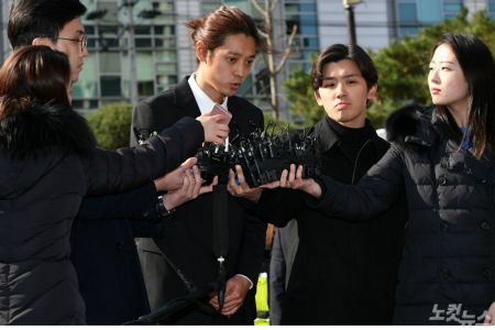출석 당시 검은 승용차를 타고 들어온 뒤, 머리를 뒤로 묶고 넥타이 없이 검은 정장을 입은 정준영은 먼저 주변을 이리저리 둘러봤다.