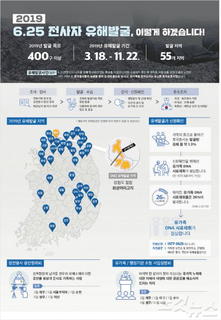 국방부는 "올해 유해발굴은 6·25전사자 4백여구 발굴을 목표로 11월까지 8개월 동안 55개 지역에서 진행하며 30여개 사·여단 장병 10만여명(연인원)이 참여한다"고 밝혔다.