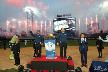 18일 2만명이 넘는 야구팬들이 몰린 가운데 창원NC파크 마산구장 개장식이 열렸다. 허성무 창원시장과 김택진 NC 구단주가 성화봉송 퍼포먼스를 하고 있다. (사진=창원시 제공)