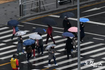 서울 등 수도권과 해안지방을 중심으로 비가 내리는 20일 오후 서울 용산구 인근에서 시민들이 우산을 쓰고 발걸음을 제촉하고 있다.