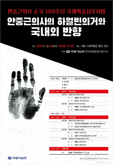 독립기념관(관장 이준식)은 안중근의사 순국 109주기를 맞아 26일 서울 고궁박물관 별관 강당에서 국제학술회의를 개최한다고 밝혔다.