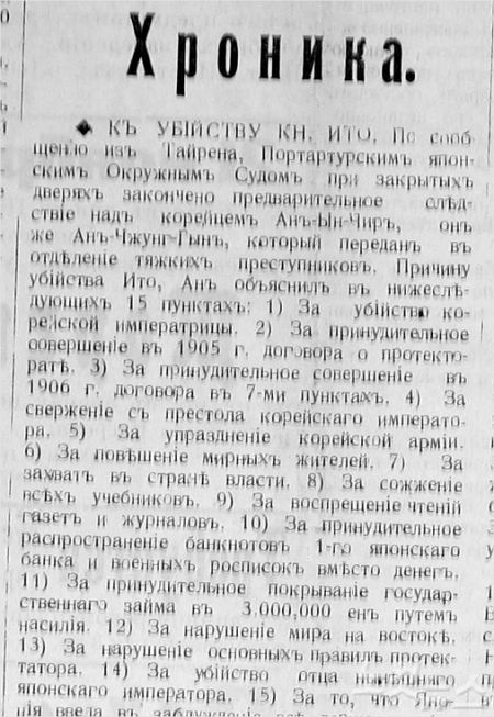 러시아 '머나먼 변방'의 1909년 11월 30일자 기사로 안중근 의사가 법정에서 이토의 15개 죄상을 언급한 내용. (사진=독립기념관 제공)