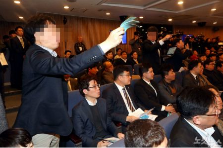 27일 오전 서울 강서구 대한항공 본사에서 열린 제57기 정기주주총회에서 한 참석자가 의사진행 발언을 요청하며 의장을 맡은 우기홍 대표이사에게 항의하고 있다. (사진=이한형 기자)