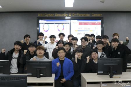 경일대 케이-해커스 동아리 학생들이 디지털포렌식 강의실에서 포즈를 취하고 있다.