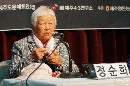 김낭규 할머니가 4.3의 아픈 상처를 이야기하고 있다. (사진=고상현 기자)
