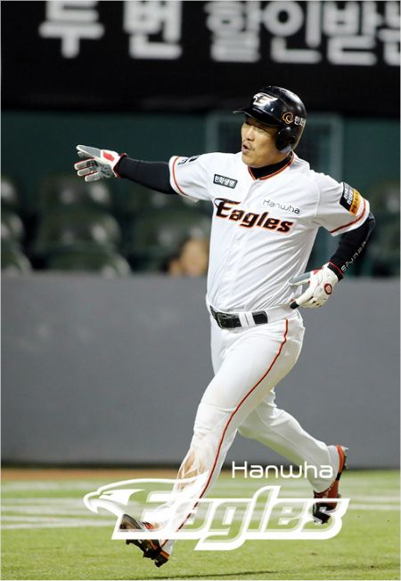 '문제 없어' 한화 정근우가 2일 LG와 홈 경기에서 2회 역전 결승 2타점 적시타를 때려내며 출루한 뒤 후속 공격 때 기분좋게 홈을 밟고 있다.(대전=한화)