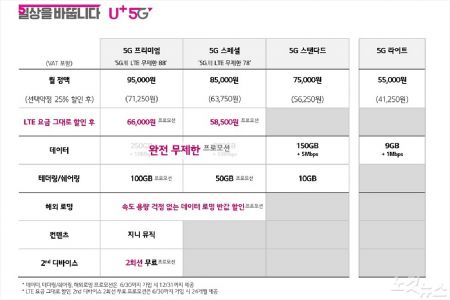 유플러스의 데이터 완전 무제한 요금제는 월정액 8만5천원(VAT포함)의 '5G 스페셜'과 월 9만5천원의 '5G 프리미엄'이다.