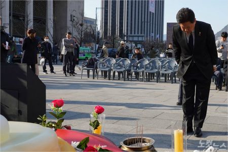 서주석 국방부차관이 3일 오후 서울 광화문 광장에 마련된 제주 4·3사건 희생자 추모공간을 찾아 희생자를 추모했다.(사진=제주4.3범국민위원회 제공)