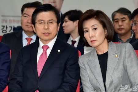 자유한국당 황교안 대표와 나경원 원내대표가 3일 저녁 영등포 중앙당사에서 4.3재보궐 선거 개표방송을 지켜보며 대화를 하고 있다. (사진=윤창원 기자)