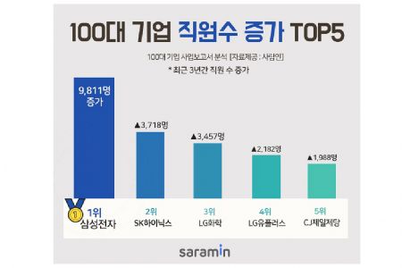 매출액 상위 100대 기업 중 삼성전자가 직원수 증가율 1위라는 조사결과가 나왔다.