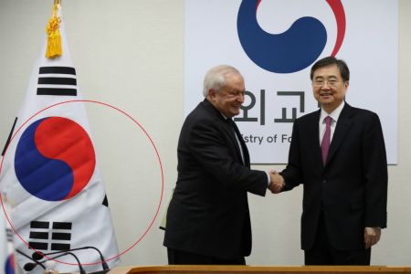 잇따른 외교 결례로 물의를 빚고 있는 외교부가 이번에는 스페인과의 차관급 회담장에 구겨진 태극기를 세워놓아 또다시 논란의 중심에 섰다.
