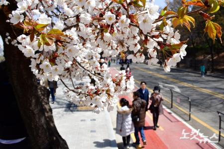 2019 여의도 봄꽃 축제가 시작된 5일 국회 의사당 옆 윤중로를 찾은 시민들이 벚꽃길을 걸으며 봄 기운을 만끽하고 있다.