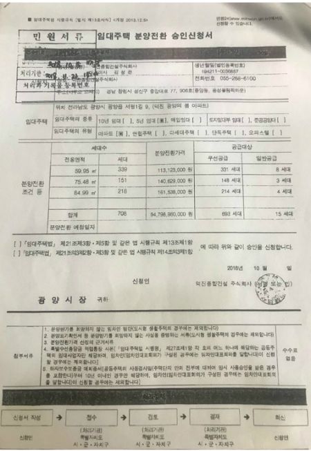광양시에서 승인한 '덕진 광양의 봄' 분양전환 승인가(사진=분양비대위 제공)