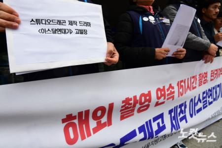 10일 오전 서울 중구 서울지방고용노동청 앞에서 열린 '해외촬영 연속 151시간, 턴키계약 관행 여전' 스튜디오드래곤 제작 아스달연대기 고발 기자회견 참석자들이 고발장을 들어보이고 있다.