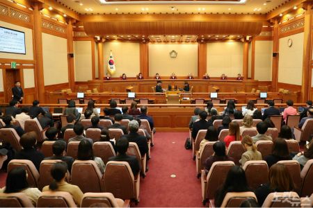 11일 오후 낙태죄 처벌 위헌 여부를 밝히 재판이 열린 서울 종로구 헌법재판소 심판정에 재판관들이 입정하고 있다. (사진=박종민 기자)