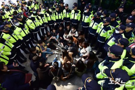 한국대학생진보연합(대진연) 소속 대학생들이 12일 국회 의원회관 자유한국당 나경원 원내대표 의원실에 진입해 '나경원, 황교안 사퇴'를 촉구하며 점거농성을 펼치다가 경찰에 둘러싸여 있다.