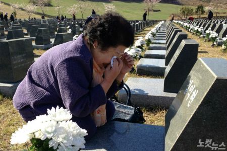 4.3 평화공원 내 행방불명인 묘지에서 한 유족이 눈물을 닦고 있다. (사진=자료사진)