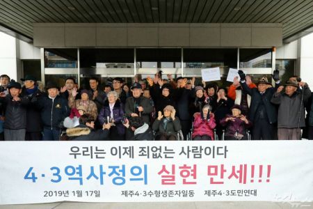 지난 1월 17일 법원이 4.3수형인에 대해 사실상 무죄 선고를 한 직후 수형인들이 기뻐하고 있다. (사진=고상현 기자)