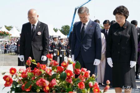 문재인 대통령이 지난해 4.3 70주년 추념식이 열린 4.3평화공원을 찾아 묵념하고 있다. (사진=자료사진)
