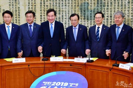 더불어민주당 이해찬 대표, 이낙연 국무총리 등이 2일 오전 국회에서 열린 고위당정협의에서 포즈를 취하고 있다. (좌측부터 홍남기 경제부총리, 조정식 민주당 정책위의장, 윤호중 민주당 사무총장, 이 총리, 이 대표, 홍영표 민주당 원내대표, 김수현 청와대 정책실장, 강기정 청와대 정무수석) (사진=윤창원 기자)