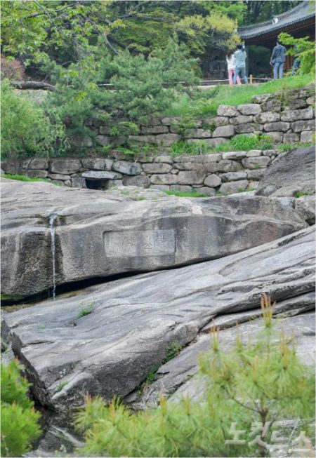 영벽지 한쪽 바위에 추사 김정희의 필체로 한시가 새겨져 있다 중앙의 나무 아래로 보이는 직사각형에 새겨져 있던 한자는 닳아서 형체가 보이지 않는다(사진=박종민 기자)