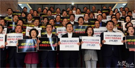 자유한국당 황교안 대표, 나경원 원내대표 등 소속 의원들이 23일 오후 국회에서 여야 4당의 패스트트랙 지정 추인에 반발해 긴급 의원총회를 가진 뒤 로텐더홀 계단에서 규탄대회를 갖고 있다. (사진=윤창원 기자)