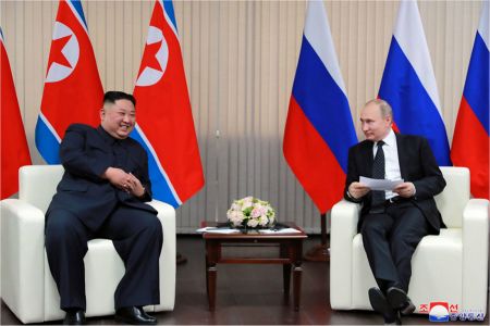조선중앙통신은 26일 홈페이지에 전날 러시아 블라디보스토크 극동연방대에서 열린 북러정상회담 사진을 공개했다. (사진=연합뉴스 제공)