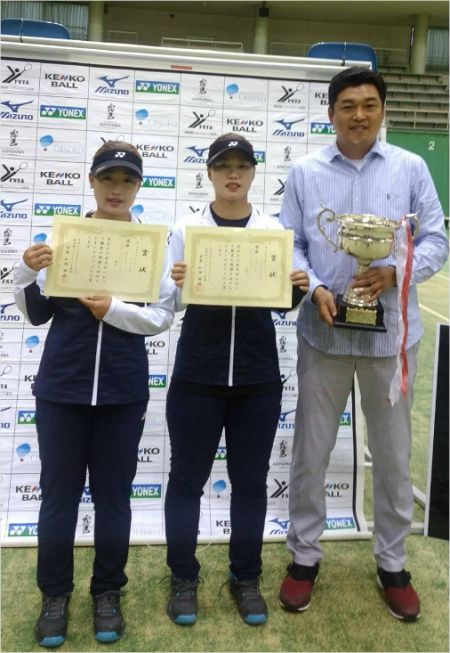 NH농협은행 백설(왼쪽부터)-문헤경 조가 일본 규슈오픈 여자 복식 우승을 차지한 뒤 유영동 감독과 함께 기념 촬영을 한 모습.(후쿠오카=대한정구협회)