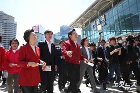 자유한국당 황교안 대표와 나경원 원내대표가 2일 오전 서울역 광장에서 ‘문재인 STOP! 서울시민이 심판합니다!’ 규탄대회를 가진 후 대합실로 향하고 있다.