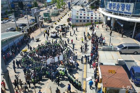 3일 자유한국당 황교안 대표가 광주를 방문해 송정역 앞에서 경찰에 둘러싸인 채 기자회견을 하고 있다.(사진=광주CBS 조시영 기자)