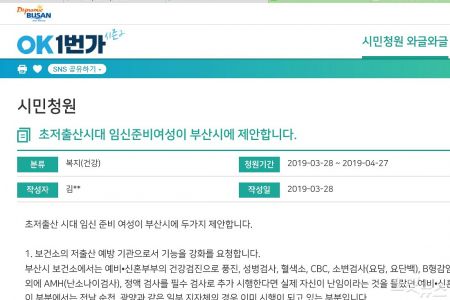 이날 김씨는 부산시청 청원 게시판인 'OK1번가 시즌2'에 '초저출산시대 임신준비여성이 부산시에 제안합니다'라는 글을 올렸다.