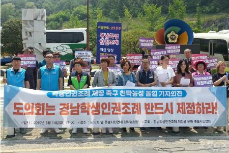 전날인 13일에는 청소년단체인 '조례 만드는 청소년'과 참교육을 위한 전국학부모회 경남지부가 경남도의회에서 잇따라 기자회견을 열고 경남학생인권조례안 제정을 촉구했다.