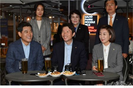 여야 3당 교섭단체 원내대표가 20일 저녁 서울 여의도 국회 인근 호프집에서 '맥주 회동'을 하고 있다. (왼쪽부터)오신환 바른미래당, 이인영 더불어민주당, 나경원 자유한국당 원내대표. (국회사진취재단)