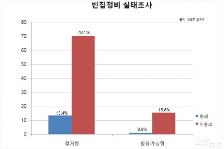 하지만 전체 2476개 빈집 중 철거에 동의한 소유자는 고작 13.4%(332동)로 70.1%(1736동)가 동의하지 않았다. 빈집을 다른 부지 등으로 활용하는 것에 대해서도 0.9%(22동)만 동의했으며 15.6%(386동)는 반대 의사를 표명했다.