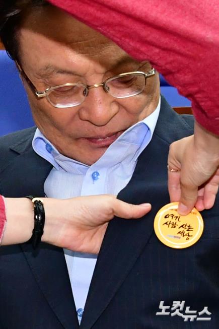 더불어민주당 이해찬 대표가 22일 국회에서 열린 당 의원총회에서 당 관계자의 도움을 받아 노무현 대통령 서거 10주기 추모 배지를 달고 있다.