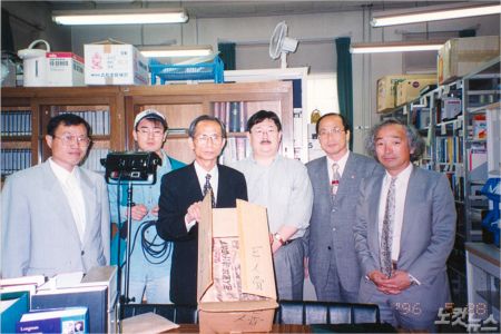 1996년 일본 북해도대학에서 유골을 반환받는 한승헌 전 감사원장(왼쪽 두번째)과 장영달 우석대 총장(왼쪽 네번째), 이노우에 가츠오 북해도 대학 명예교수(왼쪽 다섯번째). /사진=(사)동학농민혁명기념사업회 제공