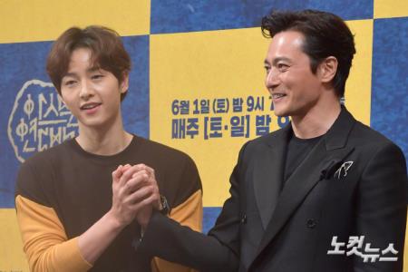 배우 송중기(왼쪽)와 장동건이 28일 서울 논현동 임피리얼팰리스호텔에서 열린 tvN 드라마 '아스달 연대기' 제작발표회에서 포즈를 취하고 있다.
