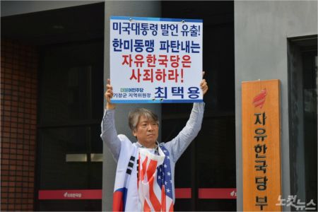 최택용 더불어민주당 기장군 지역위원장은 28일 오후 부산 수영구 자유한국당 부산시당 정문 앞에서 태극기와 성조기를 몸에 두르고 1인 시위를 벌였다.