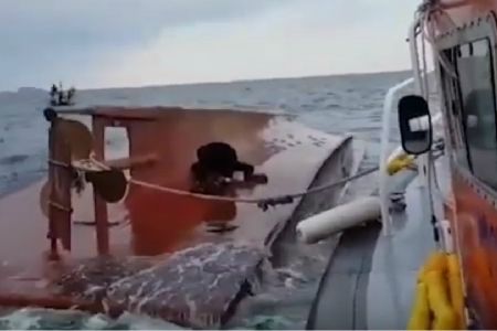 31일 오전 5시 5분쯤 전북 부안 위도 북쪽방향 9km 해역에서 덕진호가 전복된 채 발견됐다. 사진은 해경 구조대가 선내 충격실험을 통해 생존자를 파악하는 모습. (사진=부안해양경찰서 제공)