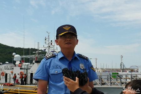전북 부안군 변산면 격포항에서 기자들의 질문에 답하는 부안해양경찰서 강중근 경비구조과장. (사진=김민성 기자)