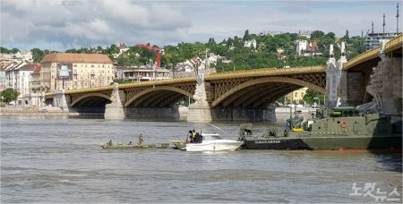 31일 한국인 관광객들이 탑승한 유람선 '허블레아니'가 침몰한 헝가리 부다페스트 다뉴브강 머르기트 다리 앞에서 수색 작업이 진행되고 있다. (부다페스트=김광일 기자)