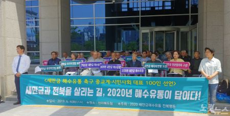 4일 오전 전북도청 앞 기자회견에는 전북지역 종교계와 시민사회단체 100명이 새만금 해수유통을 촉구하는 기자회견을 열었다. (사진=남승현 기자)