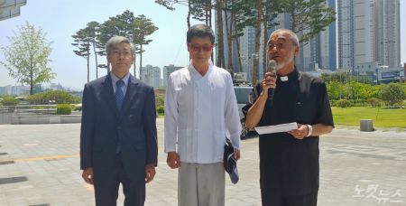4일 전북도청 앞 새만금 해수유통 촉구 기자회견에 참석한 문규현 신부와 김경일 원불교 교무, 이희운 목사(오른쪽순) (사진=남승현 기자)
