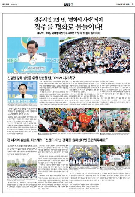 광주일보는 지난 4월 9일에는 'HWPL 세계평화 순방, DPCW로 동유럽을 넘어 유럽의 평화의 꽃 피우다'는 제목으로 신문 마지막 면에 신천지 광고를 전면에 게재했다.