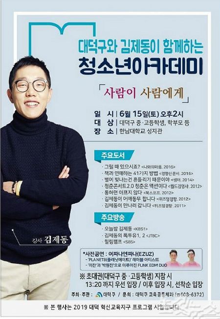 ‘대덕구와 김제동이 함께하는 청소년아카데미’ 토크콘서트는 오는 15일 관내 거주 청소년과 학부모 1600여 명을 초청해 진행할 계획이었지만, 1550만 원에 이르는 강연료를 두고 ‘고액’논란을 빚어왔다.