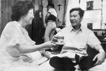 1922년 태어난 이 여사는 대표적 여성운동가로 활동하다 1962년 고 김 전 대통령과 결혼해 정치적 동지로서 격변의 현대사를 함께했다. 사진은 93년 8월 12일 김대중씨가 자택에서 이희호 여사와 담소를 나누는 모습. (사진=연합뉴스)