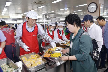 이용섭 광주시장이 11일 오전 남구 노대동 '빛고을노인건강타운 개원 10주년' 기념식에 참석해 행사를 마치고 타운 내 식당에서 배식봉사를 하고 있다.(사진=광주시 제공)